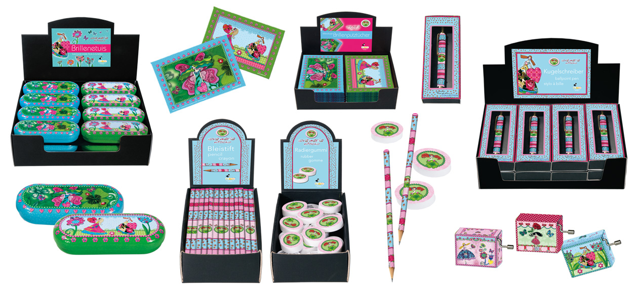 Spieluhren, Brillenetuis, Kugelschreiber, Bleistifte, Radiergummis ...